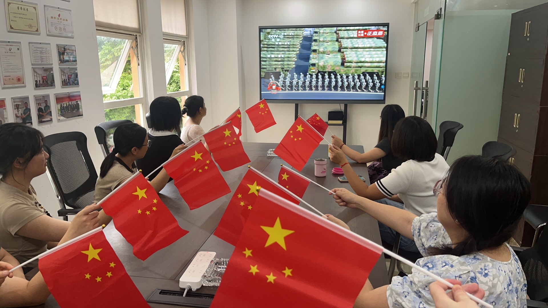 上午9时许,公司会议室内已座无虚席,全体员工怀着无比激动和自豪的心情早早等候在大屏幕前。当激昂的国歌声响起,全体员工自发肃立,注视着五星红旗冉冉升起,浓浓的爱国情怀在现场每一个人心中激荡。