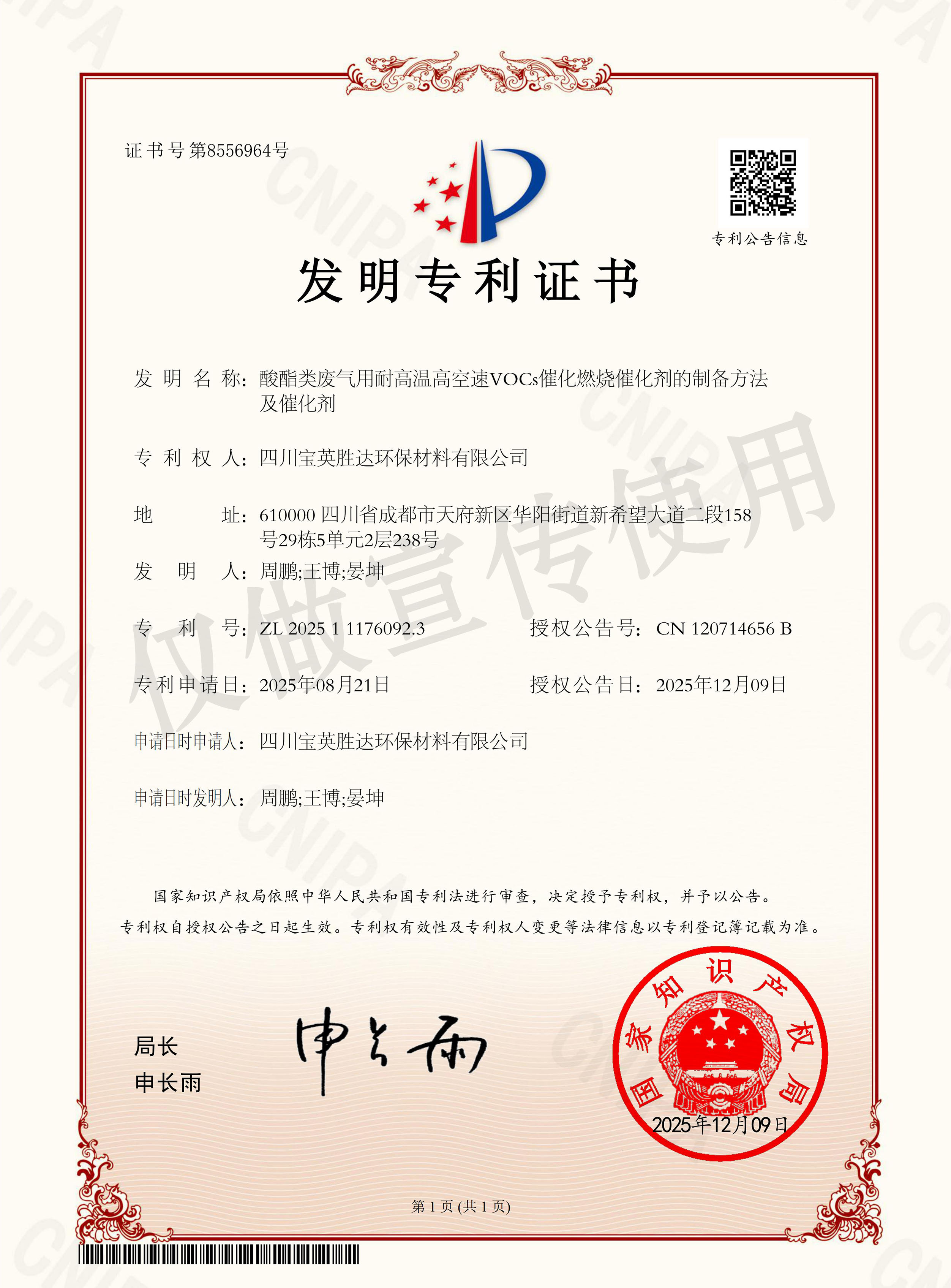 2025年9月30日,成都讯--四川宝英胜达环保材料有限公司(以下简称“宝英胜达”)近日获得项关键性技术发明专利。由国家知识产权局授予的《酸酯类废气用耐高温高空速VOCs催化燃烧催化剂的制备方法及催化剂》发明专利(专利号:CN120714656B),标志着公司在处理复杂工业废气领域取得了突破性进展,为化工、涂装等行业提供了高效的国产化解决方案。